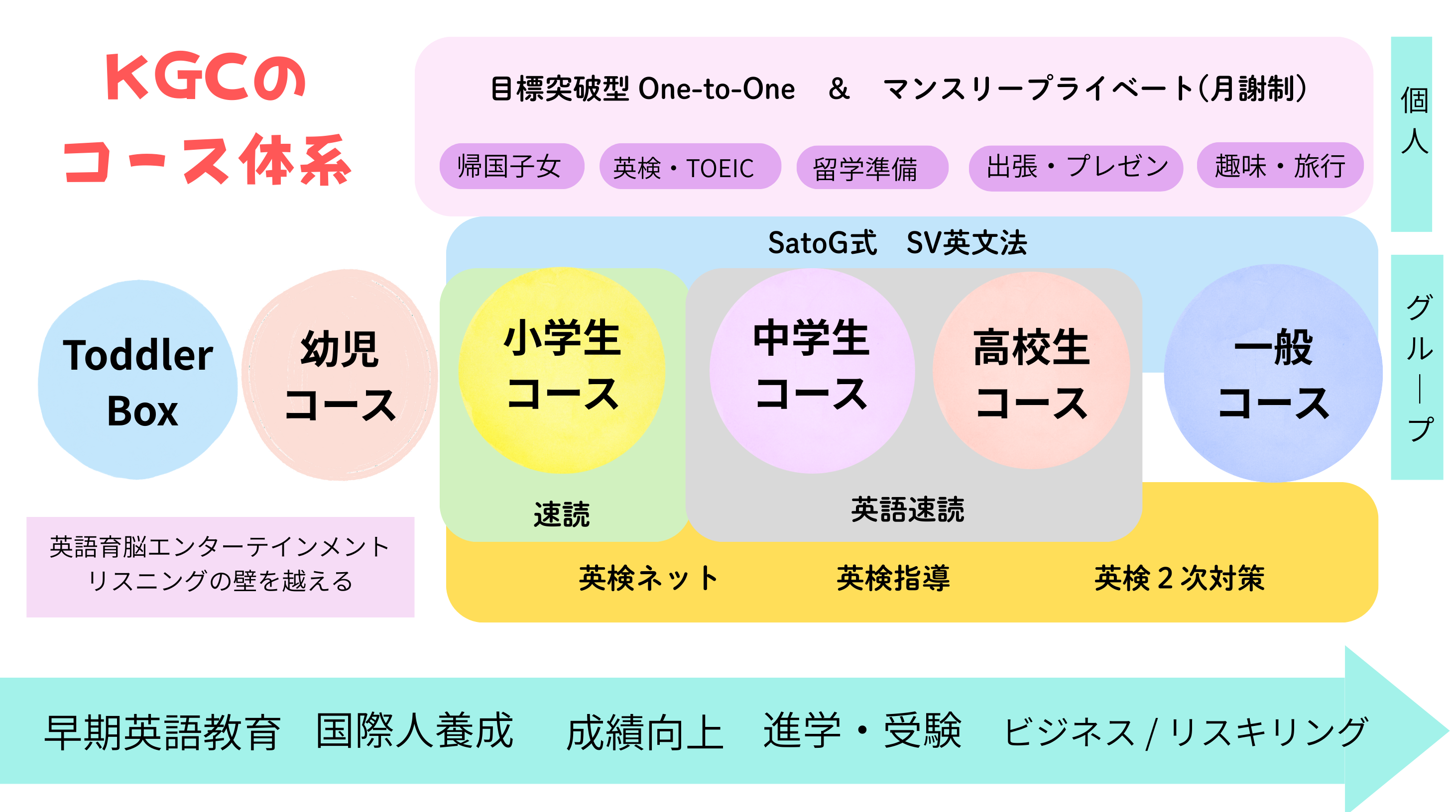 KGCは1998年4月の開校以来、28年にわたり数千人の生徒さんの指導にあたり、数多くの国際人の養成に寄与してきました。しかし、言葉も、学び方も、社会も変化していきます。KGCは、この実績に安住することなく、常に進化を続けている英語スクールの進化形です。安心して、一緒に未来に進んでいきましょう!