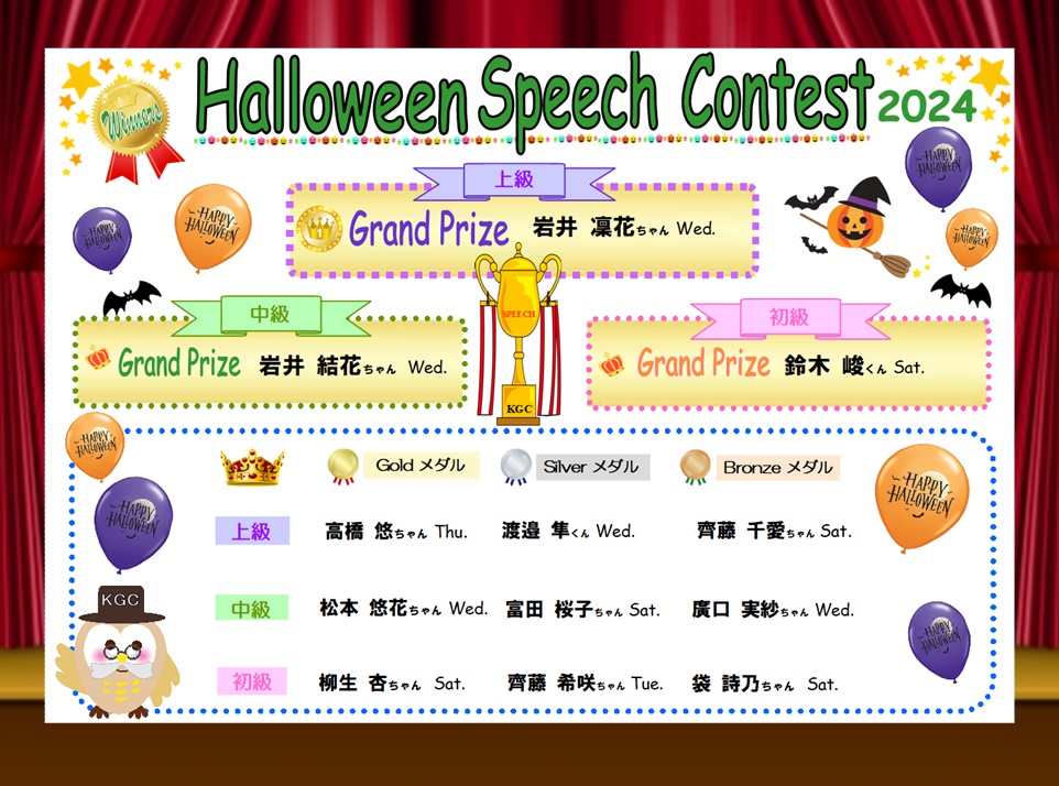 ★タイトルの上でクリックすると写真&動画をご覧いただけます★ Halloween Speech & Costume Winners 2024 (2024年度受賞者) 2024 Halloween スピーチ大会 火曜日 2024 Halloween スピーチ大会 水曜日 2024 Halloween スピーチ大会 木曜日 2024 Halloween スピーチ大会 金曜日 2024 Halloween スピーチ大会 土曜日 2024 Halloween 仮装大会 火曜日 2024 Halloween 仮装大会 水曜日 2024 Halloween 仮装大会 木曜日 2024 Halloween 仮装大会 金曜日 2024 Halloween 仮装大会 土曜日 Halloween Kinder Dance More Halloween Week Photos 2024 前の記事へ: panda dance all 前へ 次の記事へ: KGC Panda Project 次へ
